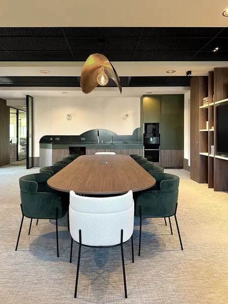 L’ensemble de l’agencement en noyer, associé à la cuisine aux nuances vertes, confère caractère, chaleur et élégance à ces lieux professionnels.