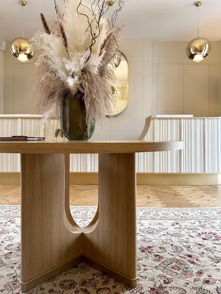 Les volumes ont été mis en valeur par de larges arches qui structurent l’espace et instaurent une fluidité naturelle entre les différentes zones. Le chêne et les tonalités douces contrastent avec les boiseries sombres et les chandeliers d’origine, créant un équilibre entre élégance classique et lignes contemporaines.