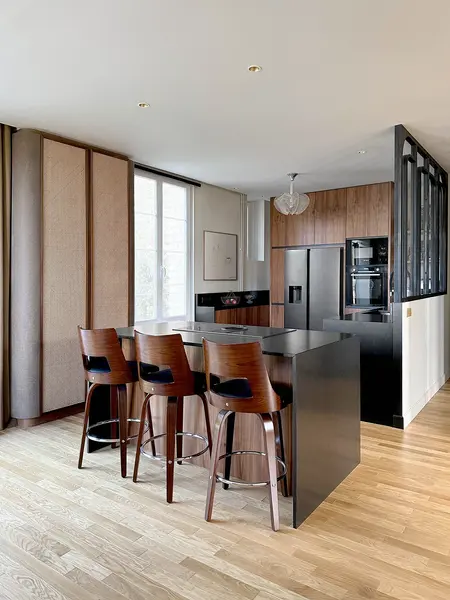 L’ambiance se veut chaleureuse : le coin cheminée conserve son esprit cocon, le parquet en chêne apporte profondeur et élégance, tandis qu’un carrelage coloré dynamise la cuisine en noyer. Une verrière et une ouverture sur le jardin viennent parfaire l’ensemble, baignant les pièces de lumière et offrant une continuité douce entre intérieur et extérieur.